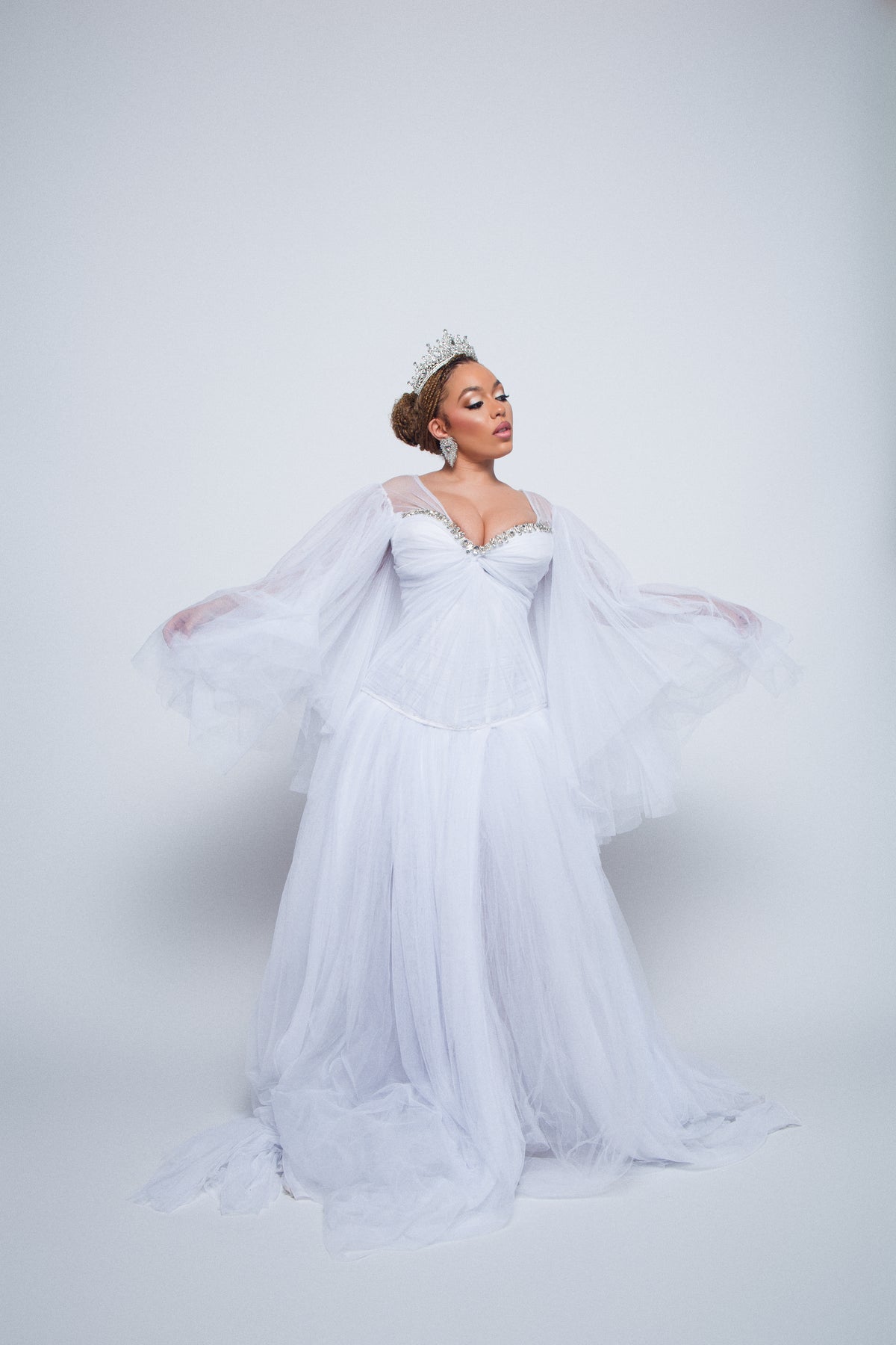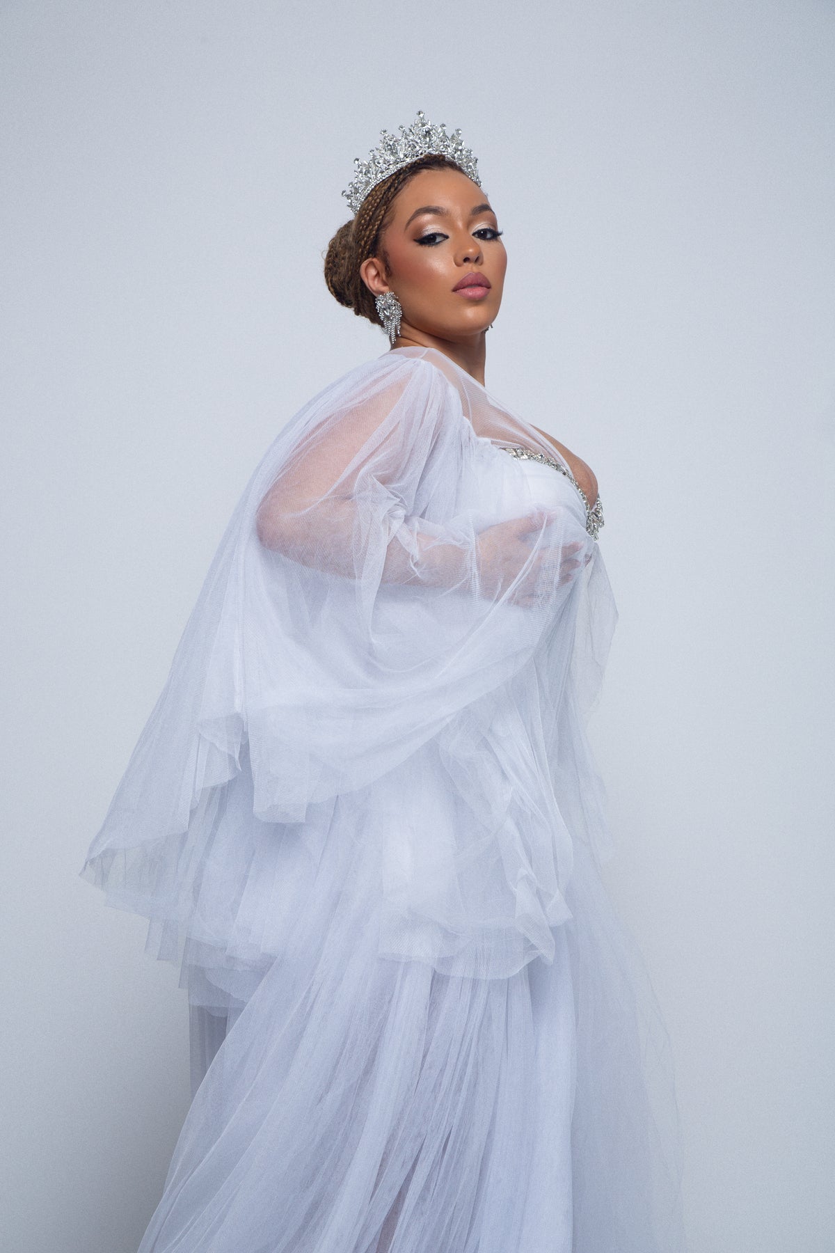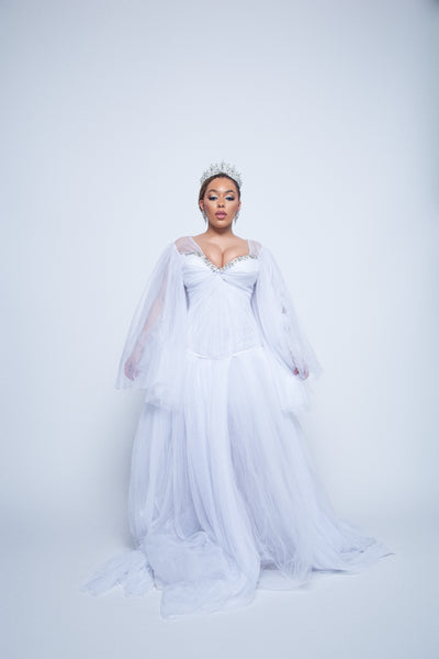 This stunning white creation embodies serenity and grace, featuring a beautifully draped sweetheart neckline, detachable corset with delicate embellishments, and cascading layers of soft tulle that float like a dream. Perfect for the bride who wants to feel utterly magnificent and radiate pure bliss on her most special day.