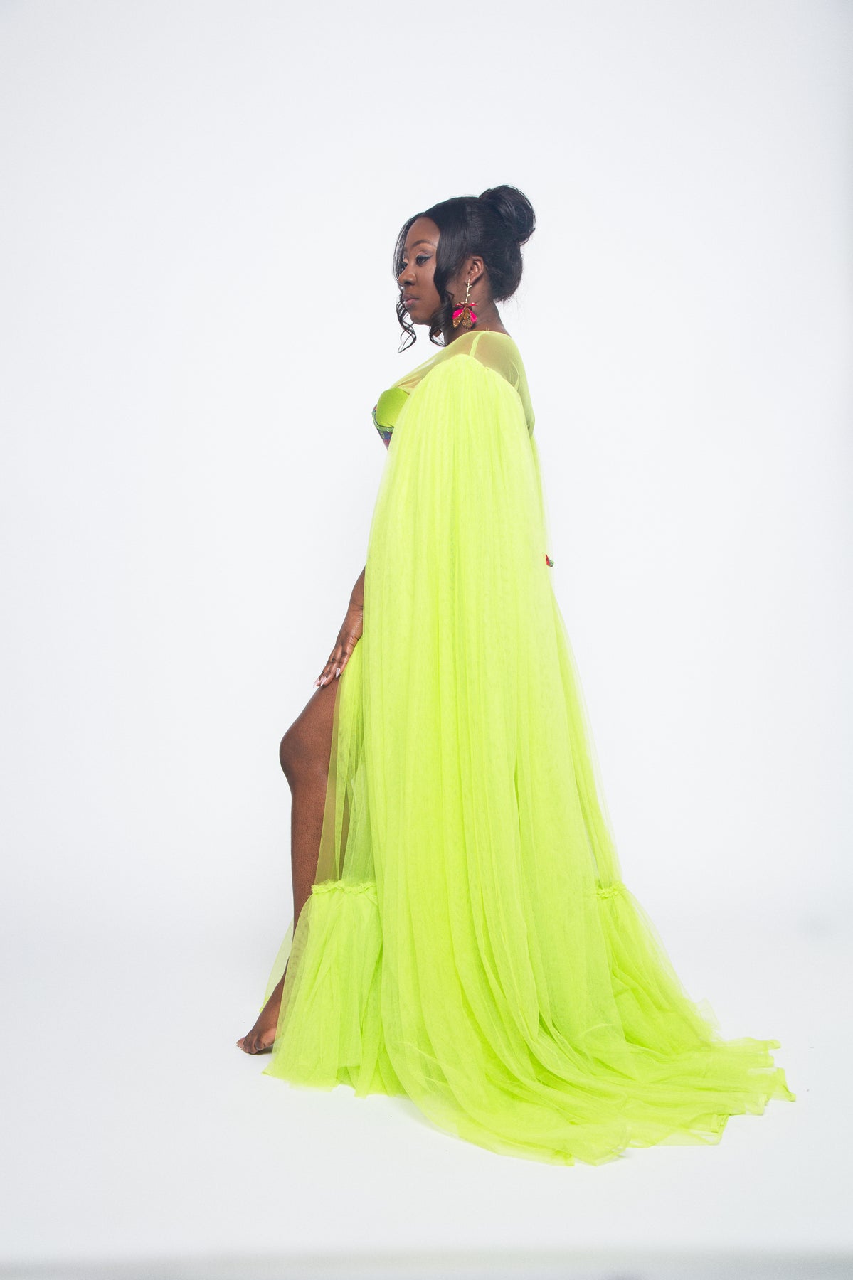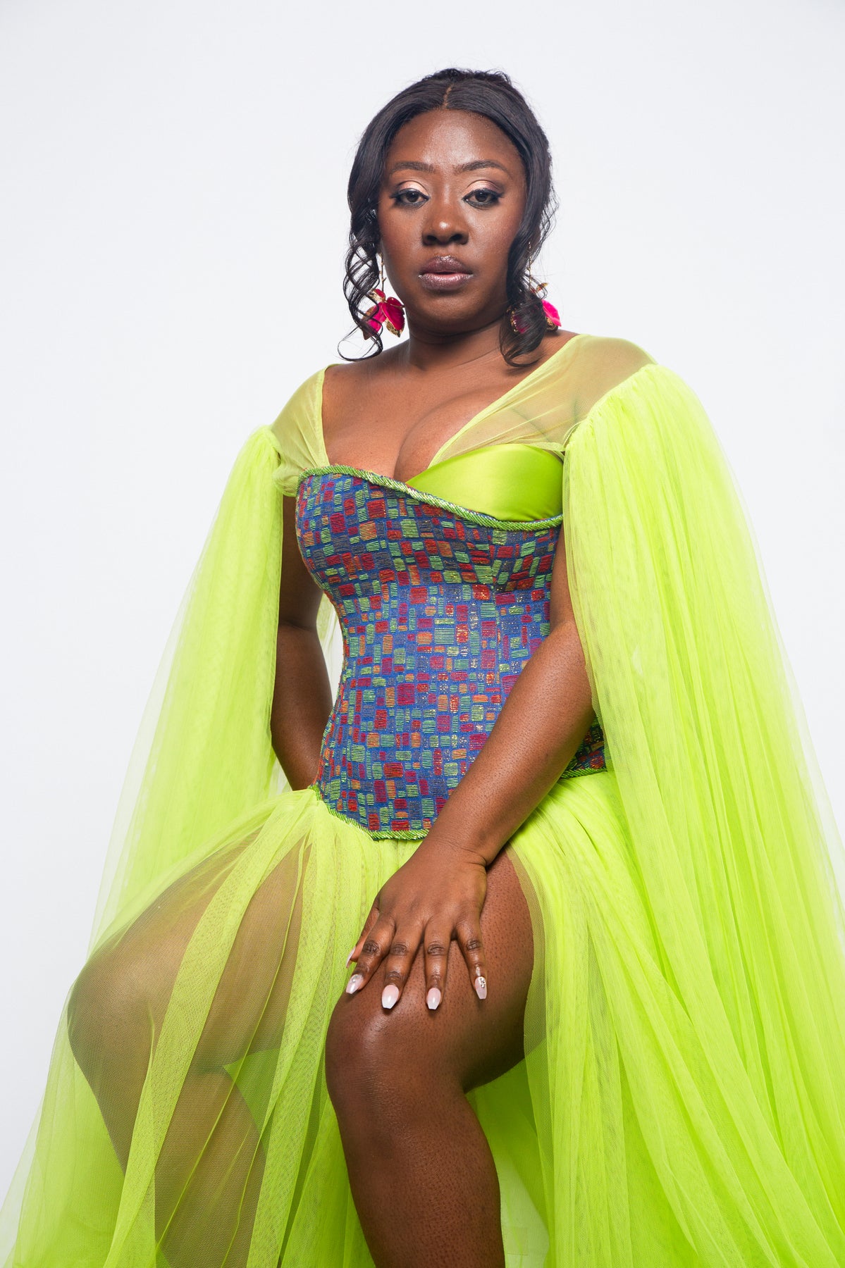 Command attention in the "Bolanle" robe, a breathtaking ensemble designed to make you shine. This vibrant creation features a striking, multi-patterned corset beautifully contrasted with an ethereal, flowing neon green skirt and dramatic cape-like sleeves. Perfect for special occasions where you want to make an unforgettable entrance.