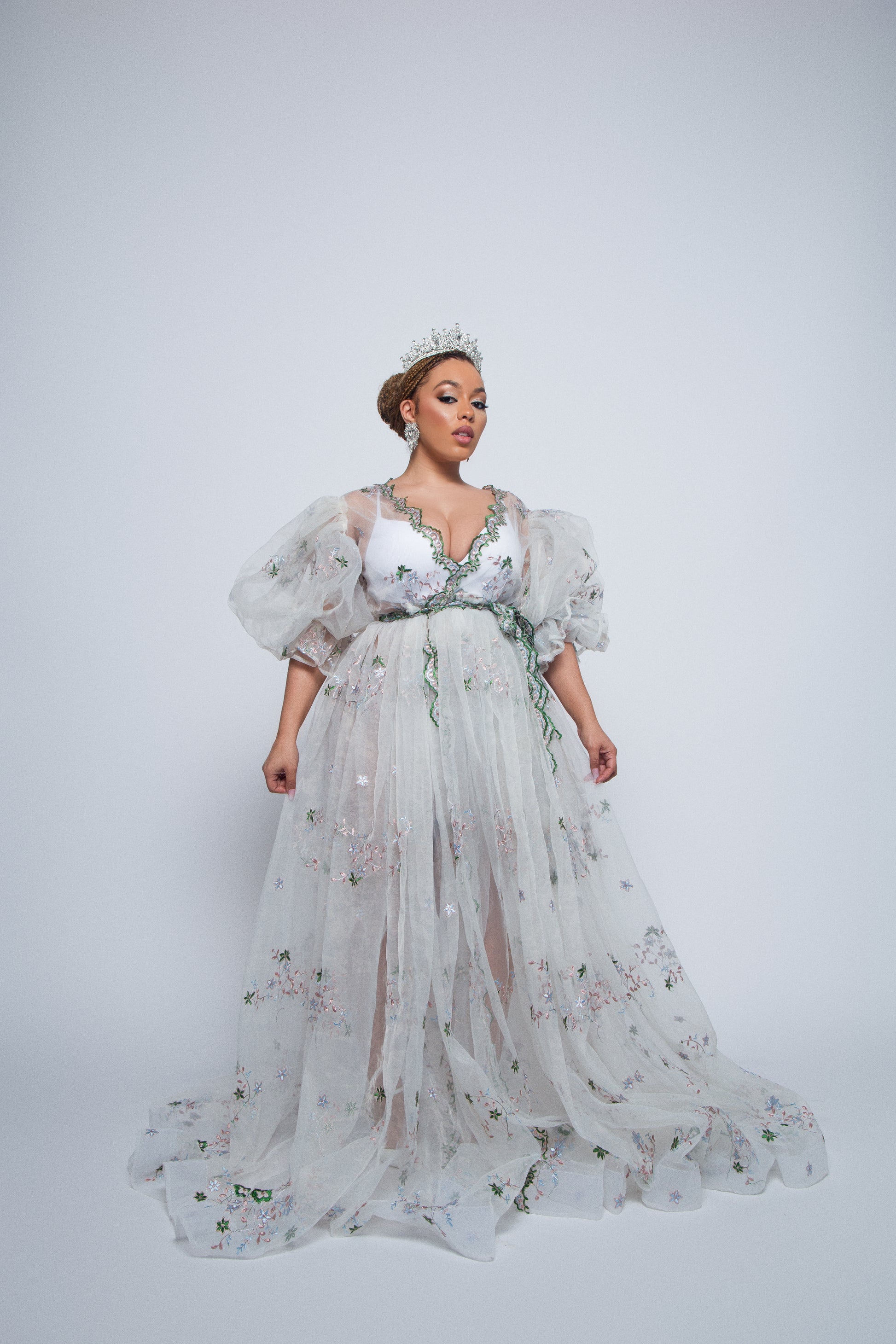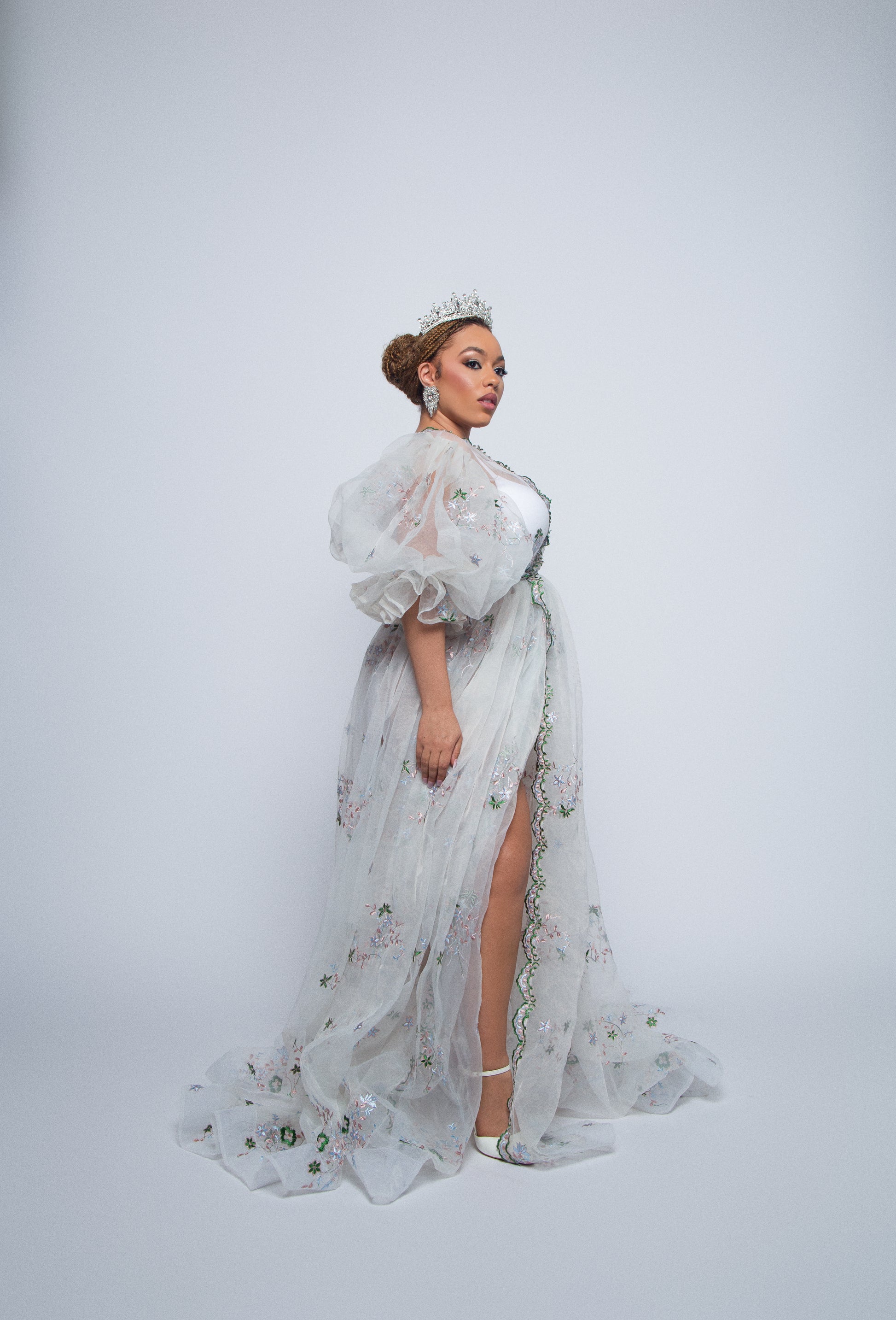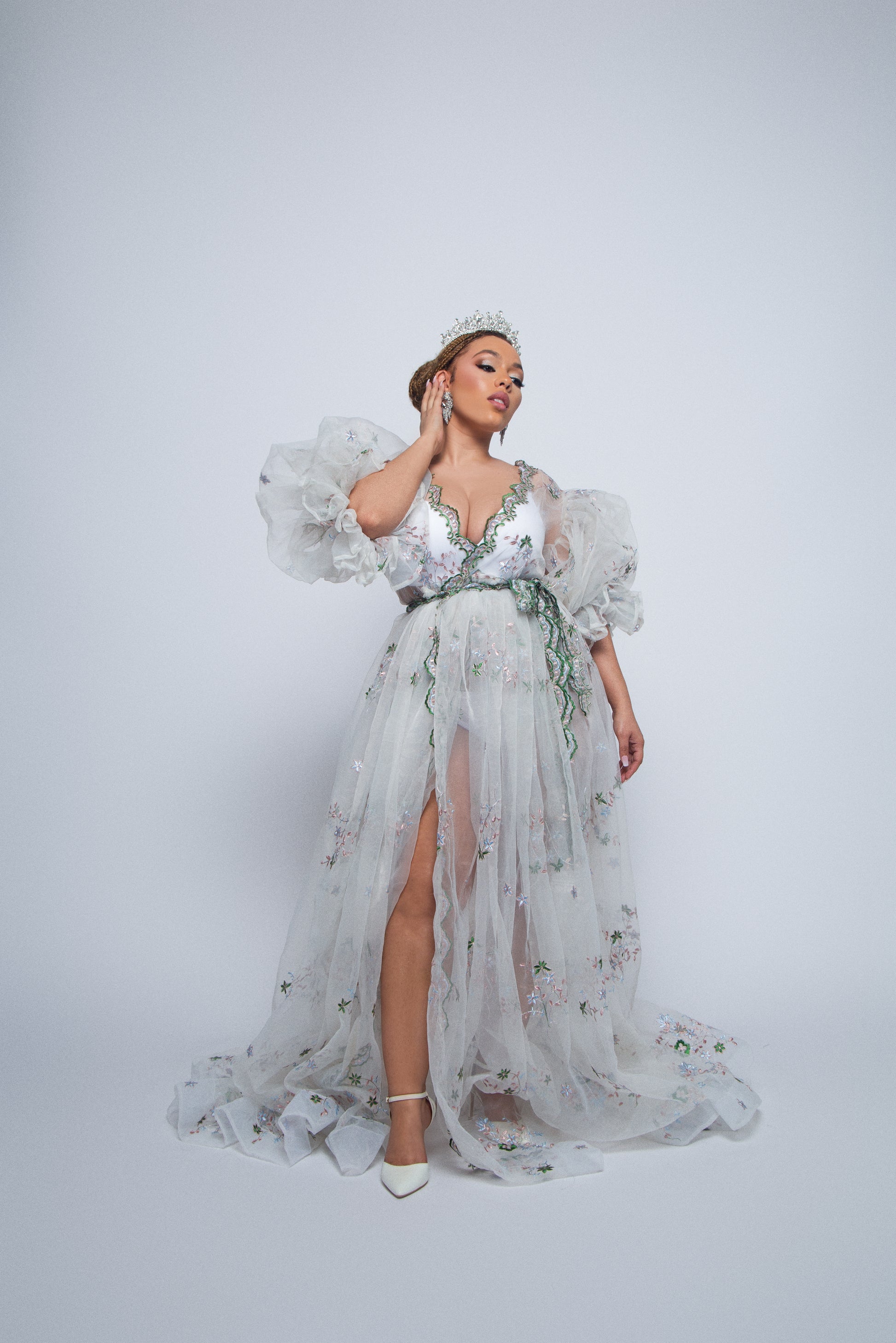 This exquisite piece captures the essence of a blossoming garden in full splendor, featuring delicate floral embroidery on ethereal sheer fabric, voluminous sleeves, and a flattering silhouette designed to make you feel like royalty. Perfect for creating unforgettable moments, this robe embodies grace and effortless charm.