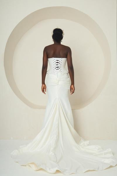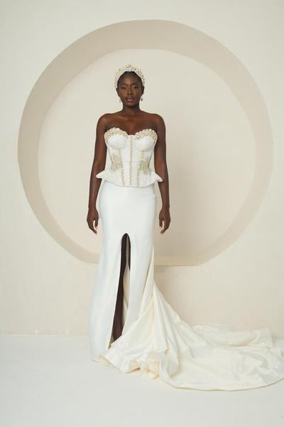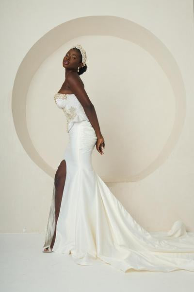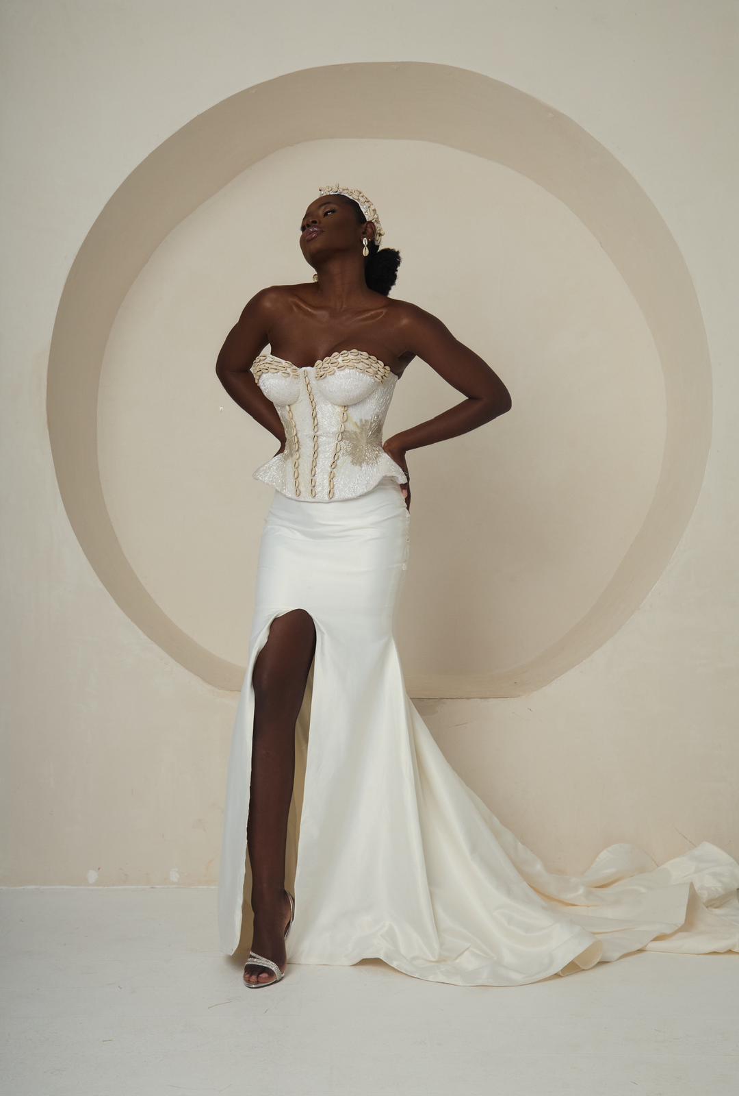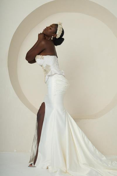 Introducing Ìyá Àgbà, an ensemble that celebrates regal strength and timeless elegance. This two-piece set features a sculpted, corset-style bodice with a refined peplum waist. The bodice is a true work of craftsmanship, adorned with delicate silver and white embellishments. Paired with a sleek, high-slit mermaid skirt, the look is both modern and classic. The skirt flows effortlessly into a subtle train, adding a touch of drama with every step. Ìyá Àgbà is a powerful tribute to matriarchal grace, designed for the woman who embodies both beauty and authority.