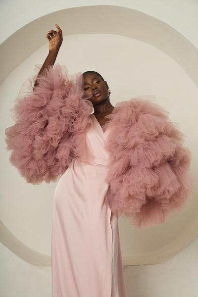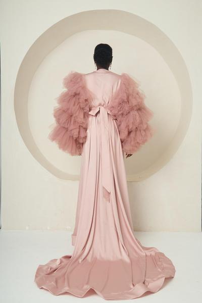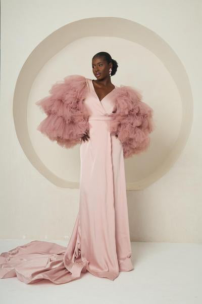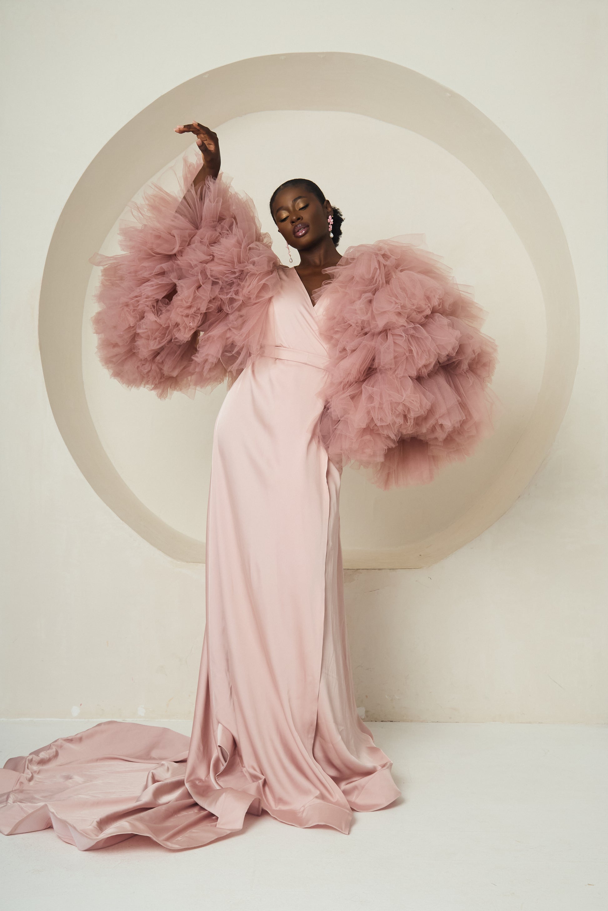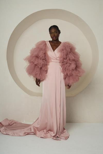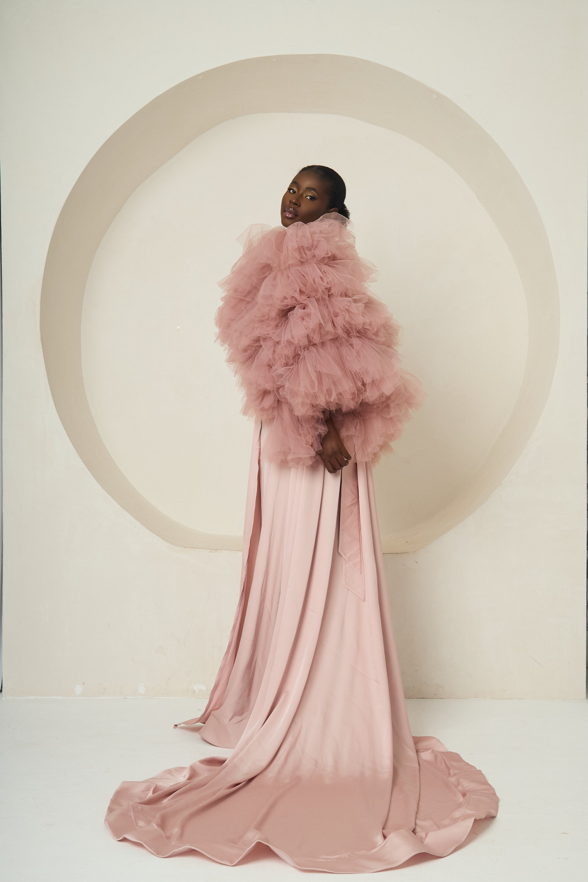 Introducing OJU’RÉ, a gown that commands attention with its breathtaking harmony of drama and delicacy. This exquisite creation features a fluid silk duchess body in a soft blush pink, designed to drape gracefully along the form. The gown becomes a striking canvas for its most captivating detail: oversized, cloud-like sleeves, sculpted from layers of hand-gathered blush tulle. A subtly cinched waist enhances the silhouette before the skirt cascades into a flowing, graceful train.